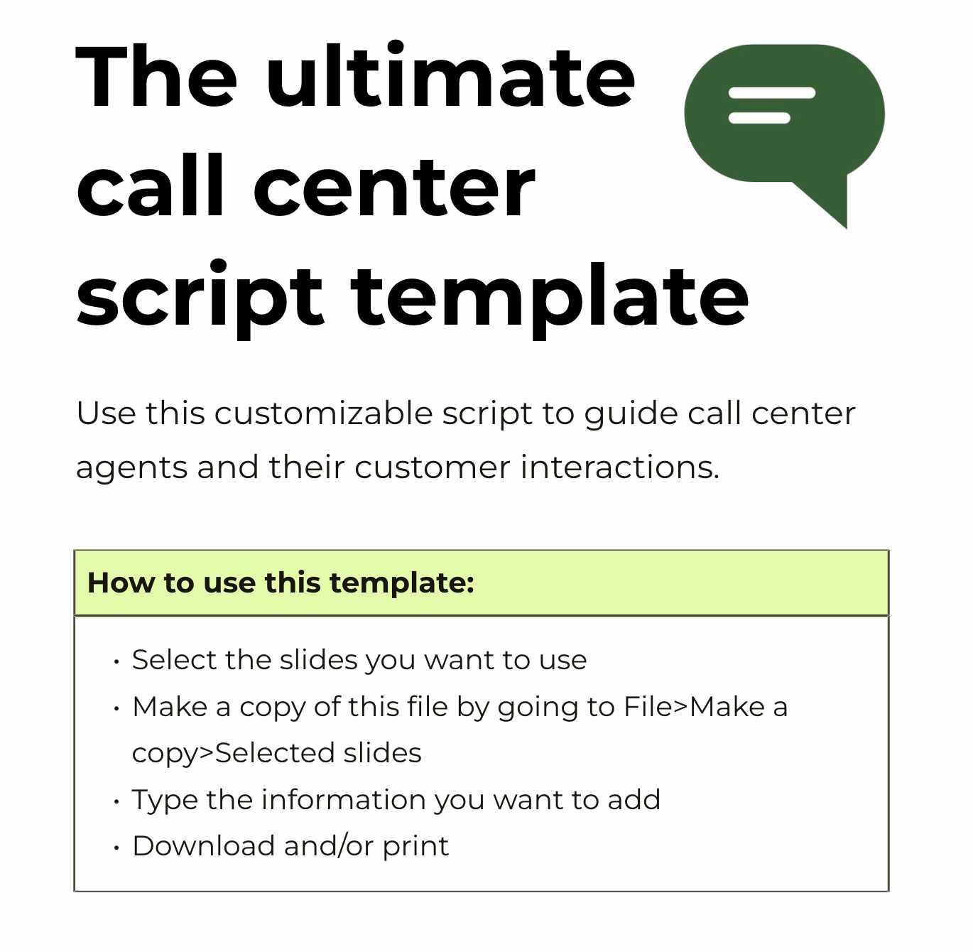 Whether you’re starting a call center or updating current processes, use our downloadable template with categorized snippets and tips to create effective, specific call center scripts for your team.
