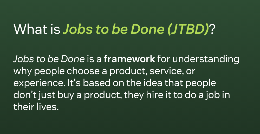 Jobs to Be Done, often shortened to JTBD, is a framework for understanding why people choose a product, service, or experience. It’s based on the idea that people don’t just buy a product, they hire it to do a job in their lives.