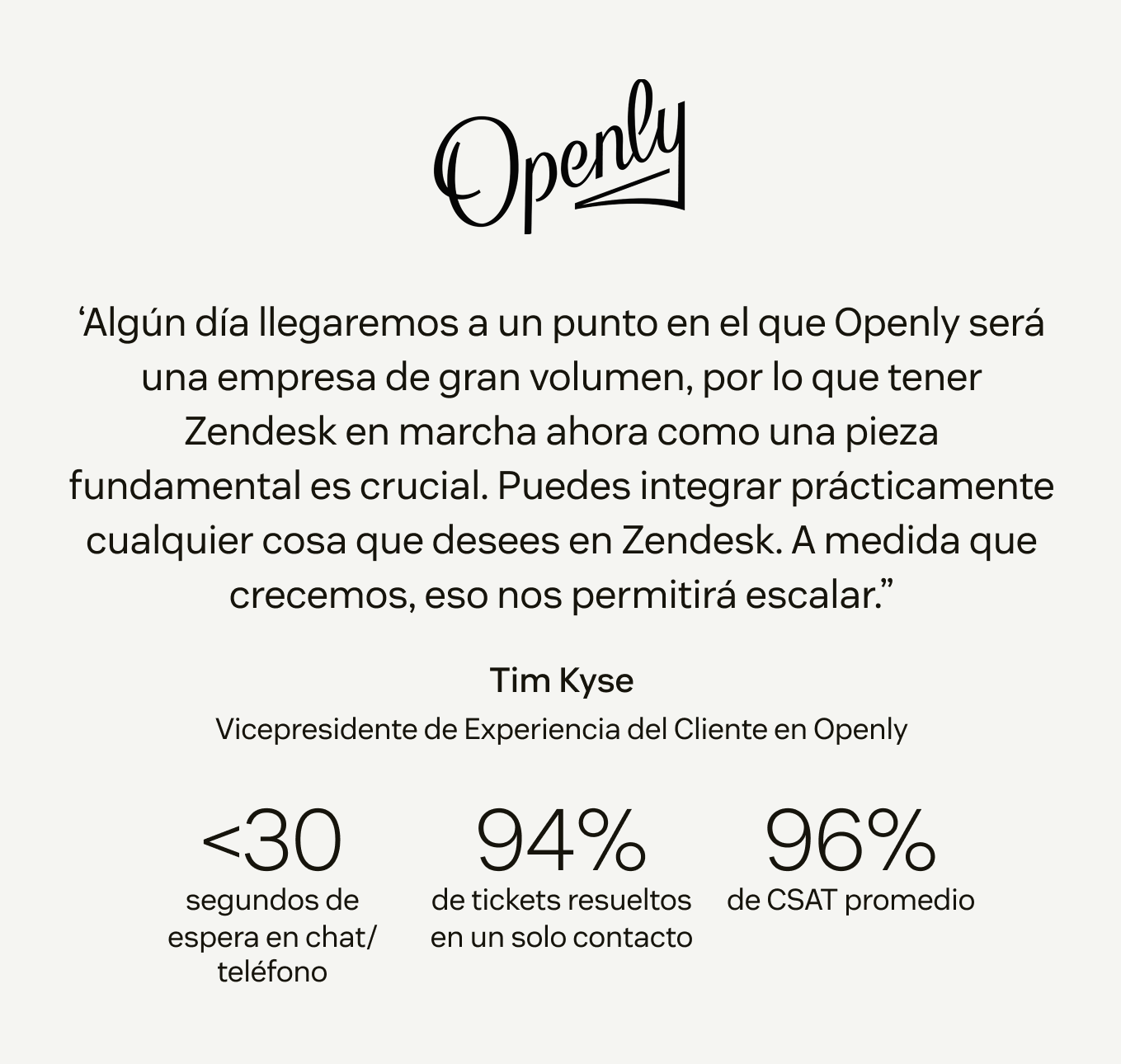 Obtendras acceso completo a la suite de Zendesk para personalizar tu espacio de trabajo, incorporar compañeros de equipo, integrar herramientas y monitorear las métricas de resolución y rendimiento sin problemas.