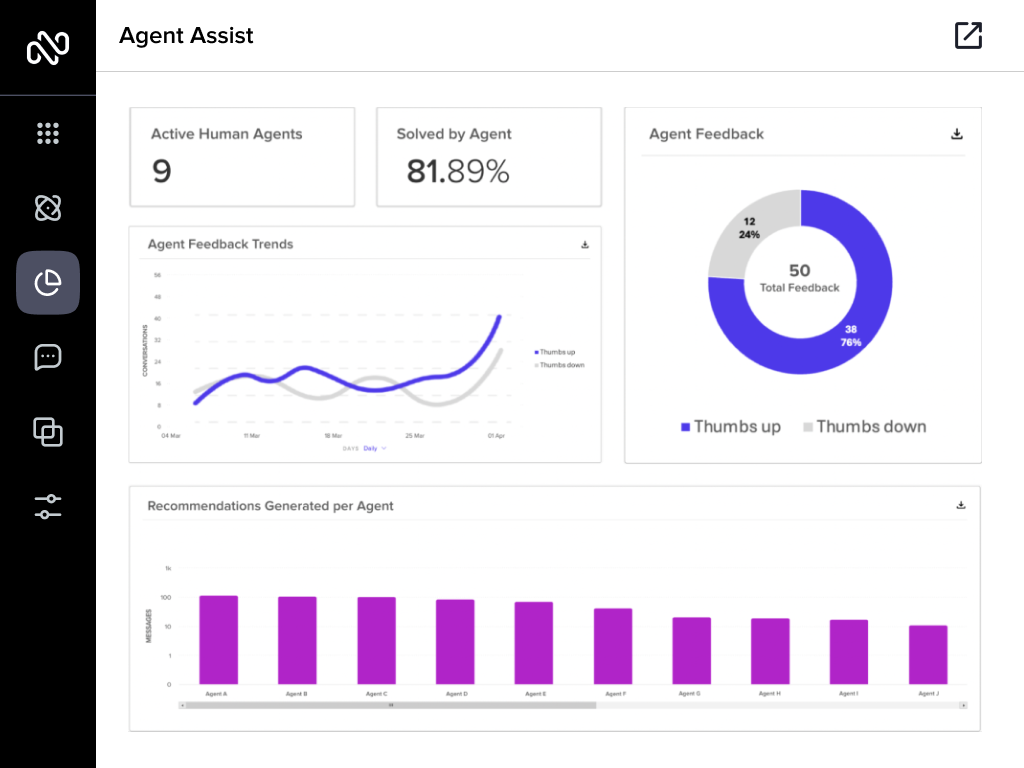 Intelligent AI Co-Pilot: Agent Assist equips agents with smart suggestions, conversation context, sentiment analysis, and deep data integration, reducing handling times.