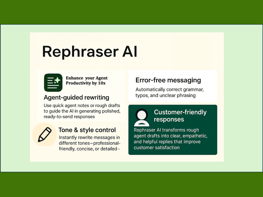 - One-Click Simplicity – Refine responses instantly without disrupting agent workflows.