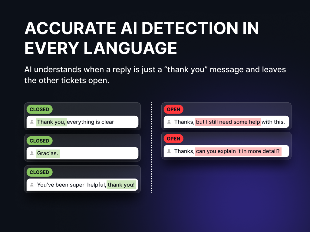 - Accurate ticket detection: Context-aware AI distinguishes thank you replies from real customer requests, avoiding false closures caused by simple keyword triggers.