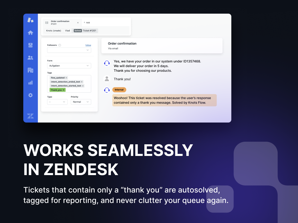 A solved ticket should remain solved, but even a simple thank you reply reopens the case. These reopened tickets create extra work for agents, clutter queues, and distort SLA reporting. Basic triggers or keyword rules can't reliably automate this process; they risk closing real requests or miss thank you replies in other languages.