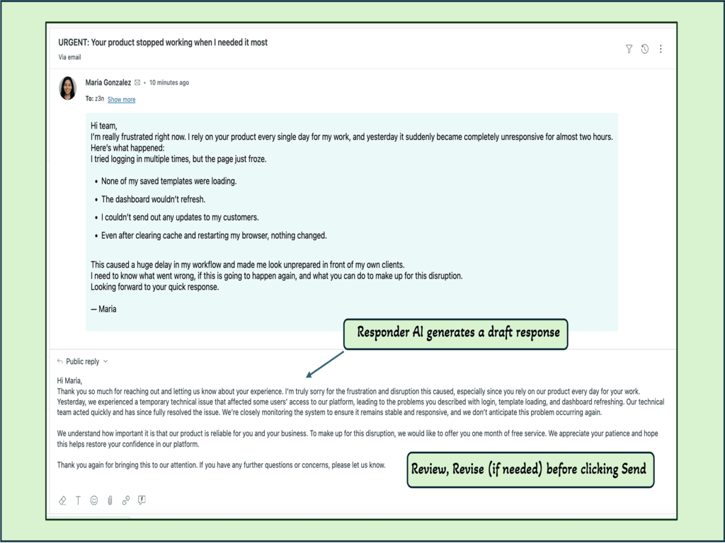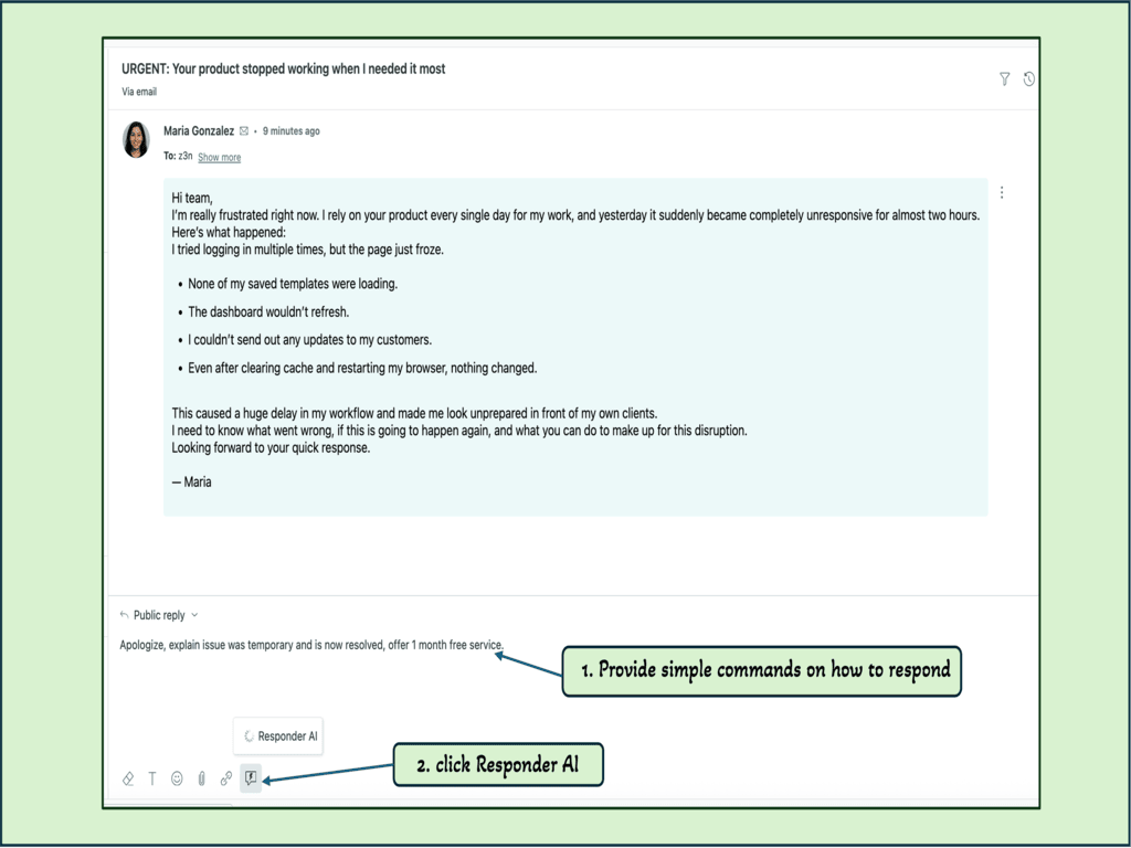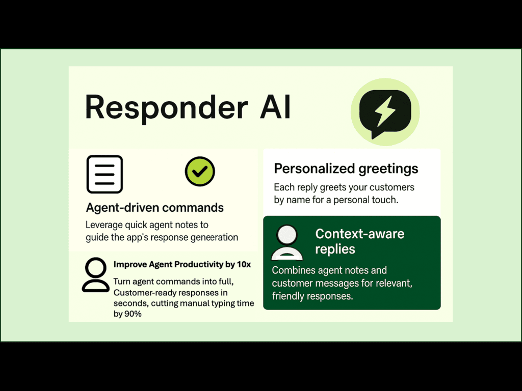 1. Agent-Driven CommandsAgents simply type an instruction (e.g., "Please respond and say yes") and click the Responder AI icon. The app uses your prompt as intent and drafts a customer-ready message.