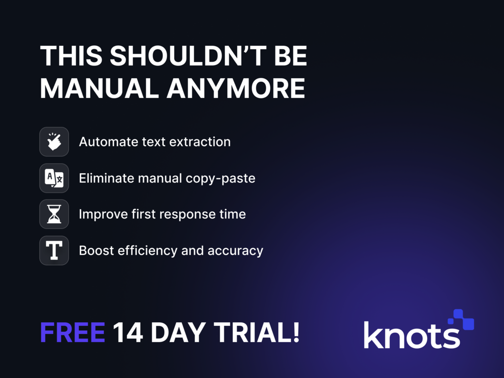 Convert PDFs, Scans + Images to Text solves this problem by using Optical Character Recognition to automatically extract text from image-based documents and turn it into actionable data. The app works silently in the background, turning images into machine-readable text before an agent even sees the ticket.